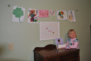 A friend of mine mentioned wanting to hang up some sort of line for her kids' art work. I loved the idea! We have drawings, paintings, and colorings of Elise's all over our fridge. It would be fun to be able to display and contain her art in a better way.